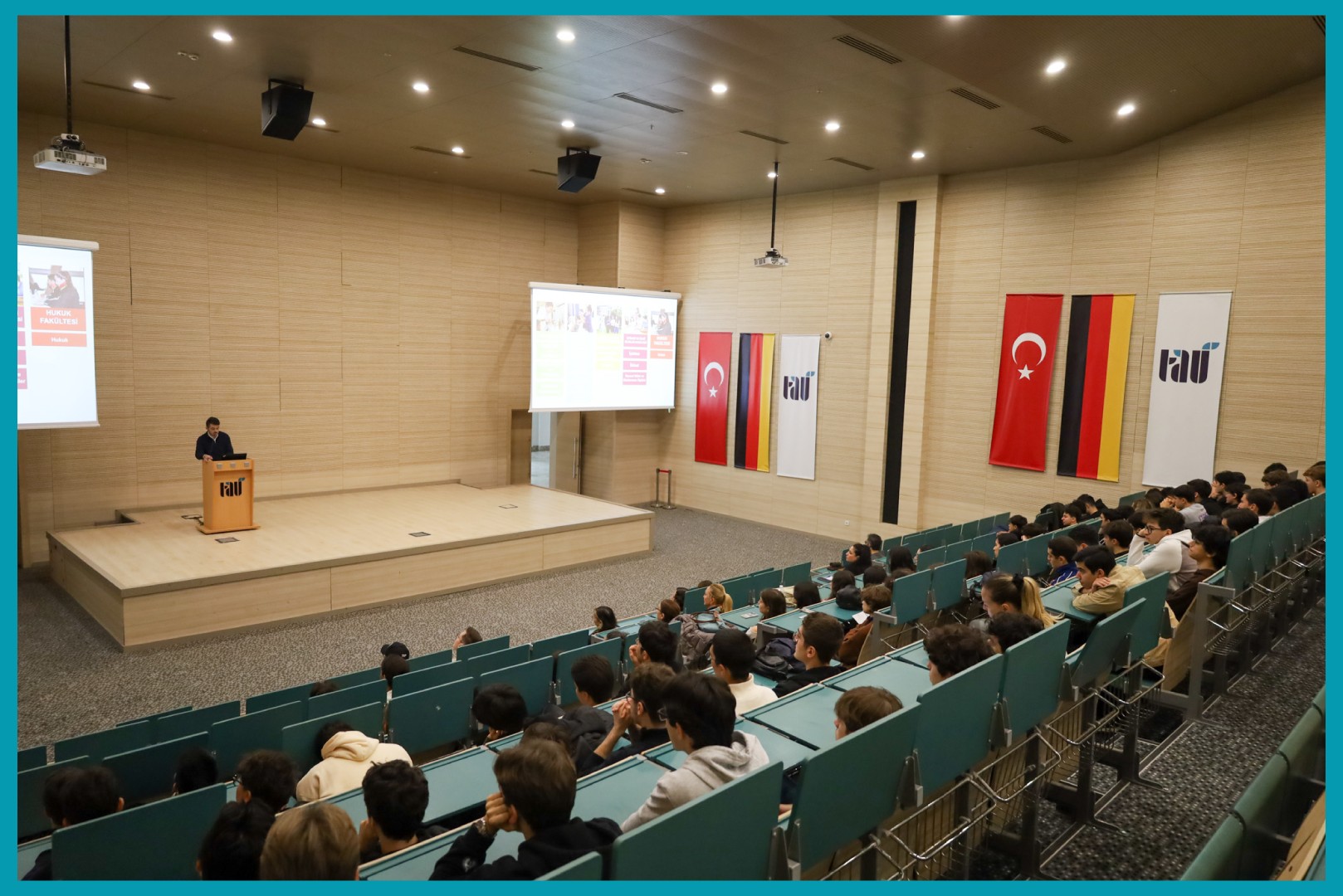 Özel kontenjan liselerimiz arasında yer alan Özel Alman Lisesi öğrencileri, 18 Kasım 2025 tarihinde Üniversitemizi tanıtım programı kapsamında ziyaret etti. Derslikler Binası B Blok Konferans Salonu’nda gerçekleştirilen program, İletişim Koordinatörlüğümüzden Öğr. Gör. Ceyhun Bayraktar'ın gerçekleştirdiği genel tanıtım sunumuyla başladı. Öğrenciler, Üniversitemizin akademik yapısı, çok dilli eğitim modeli, uluslararası imkânları ve kampüs yaşamına ilişkin kapsamlı bilgiler edindi. Sunumun ardından program, fakültelere ilişkin bilgilendirmeler ile devam etti.