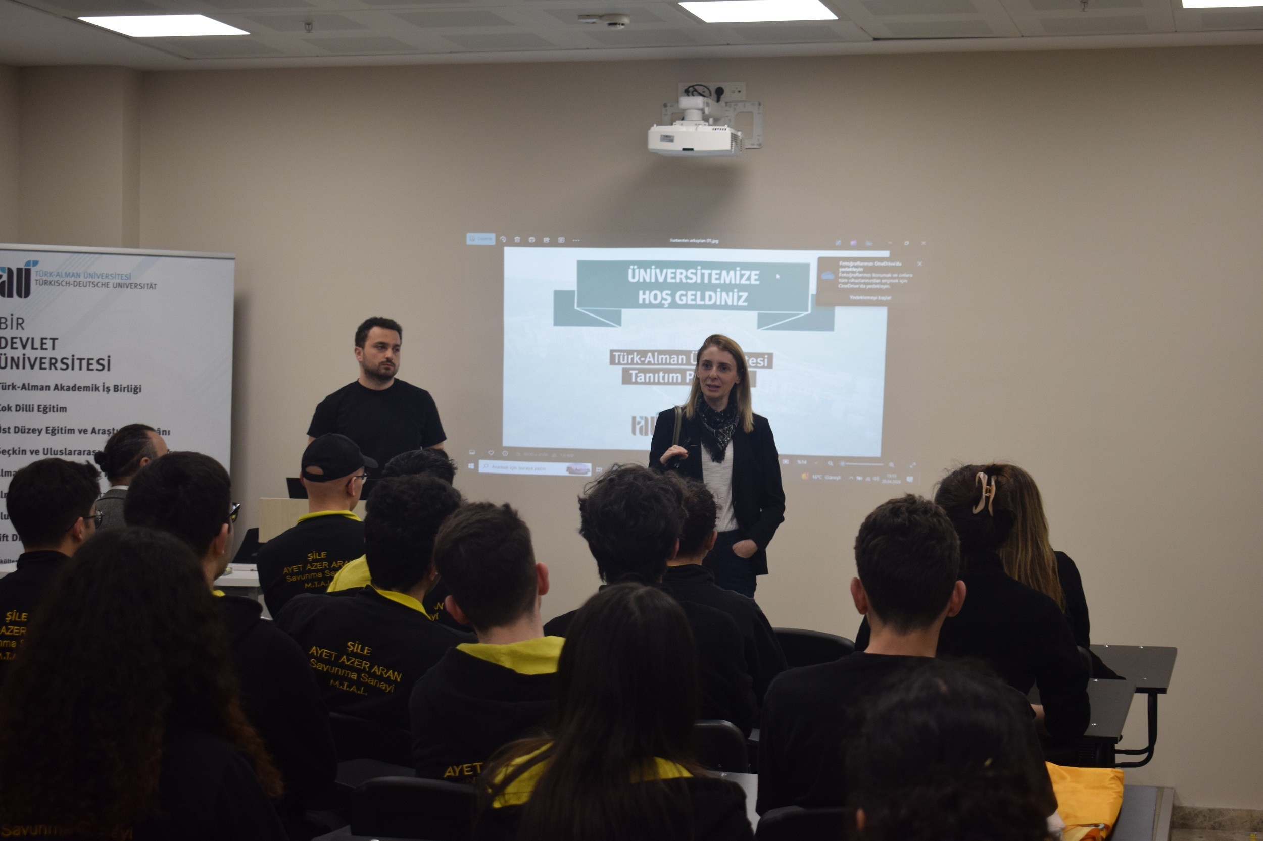 Ayet Azer Aran Savunma Sanayi Mesleki ve Teknik Anadolu Lisesi öğrencileri, 20 Nisan 2026 Pazartesi günü Üniversitemizi ziyaret ederek kampüs ortamını yakından deneyimleme fırsatı buldu. İletişim Koordinatörlüğü Tanıtım Salonu’nda düzenlenen programda, Üniversitemizin eğitim modelleri, akademik yapısı ve sunduğu zengin sosyal olanaklar konuklara detaylıca aktarıldı. Yapılan bilgilendirme sunumunun ardından öğrenciler merak ettikleri soruları sorma imkânı buldular. Program, kampüs turunun ardından günün anısına çekilen fotoğraflarla noktalandı.